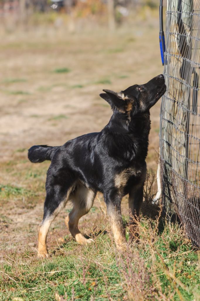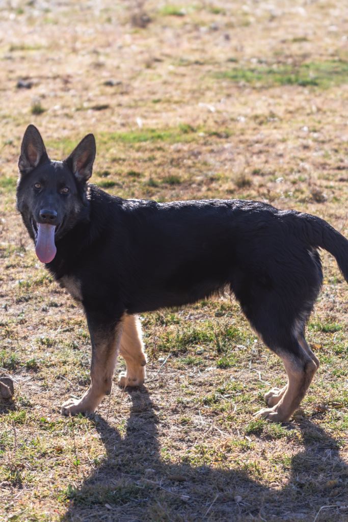 Apollo is turning into quite the male! He is going to be GORGEOUS when he’s matured; a powerful, well-built, large male. Apollo has stayed because we don’t believe he is fit for a pet home, unless they are well experienced with WORKING LINE GSDs (or similar breeds) and have handled high drive dogs before. Apollo is VERY high drive. His prey drive is INTENSE, he’s very handler oriented, and very environmentally solid. He can be a bit sensitive to correction, but his drive will be able to carry him through all kinds of situations as he grows and learns. We’d love to see this boy in a sport home. He has full, calm grips.